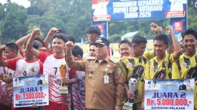 KOTABARU – Turnamen Sepak Bola Bupati Cup 2025 resmi ditutup oleh Bupati Kotabaru, H. Muhammad Rusli, S.Sos, di Stadion Bamega Kotabaru, Senin (8/9/2025). Penutupan tersebut menjadi puncak rangkaian pertandingan yang telah berlangsung selama beberapa pekan dengan melibatkan puluhan tim dari tingkat pelajar dan umum.