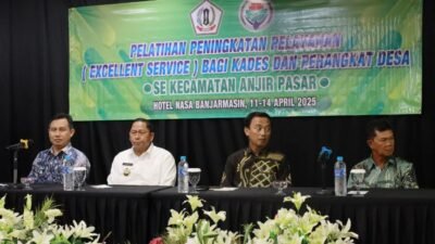 Banua Update, Barito Kuala – Pemerintah Kabupaten Barito Kuala menunjukkan komitmen dalam meningkatkan kualitas pelayanan publik di tingkat desa melalui pelatihan “Excellent Service” bagi kepala desa dan perangkat desa se-Kecamatan Anjir Pasar. Pelatihan ini dibuka langsung oleh Bupati Barito Kuala, H. Bahrul Ilmi, pada Jumat (11/4/2025) di Hotel Nasa, Banjarmasin.
