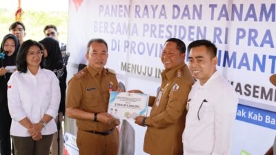 Banua Update, BARITO KUALA – Presiden Prabowo Subianto bersama Menteri Pertanian Amran Sulaiman menghadiri Panen Raya Padi Serentak yang digelar di 14 provinsi dan 198 kabupaten/kota di seluruh Indonesia, Senin (7/4/2025). Panen serentak ini melibatkan 5.702 petani, 13 gubernur, 181 bupati/wali kota, serta berbagai unsur kementerian dan lembaga strategis termasuk BULOG, BPS, dan PT Pupuk Indonesia.